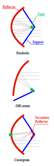 More exotic types include the off-set parabolic antenna, Gregorian and Cassegrain types. In the off-set, the feed element is still located at the focal point, which because of the angles utilized, is usually located below the reflector so that the feed element and support do not interfere with the main beam. This also allows for easier maintenance of the feed, but is usually only found in smaller antennas.